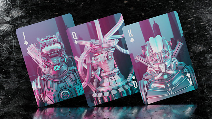 We wanted to create a deck that could reflect the exciting pop culture hype for the fans and, at the same time, have a luxurious look for cardists and magicians. There are very few decks printed with a cyberpunk thematic so far and even less from Bicycle and rarely one with a 3D design. Therefore, this genre was a perfect match and a good choice for our unique style.