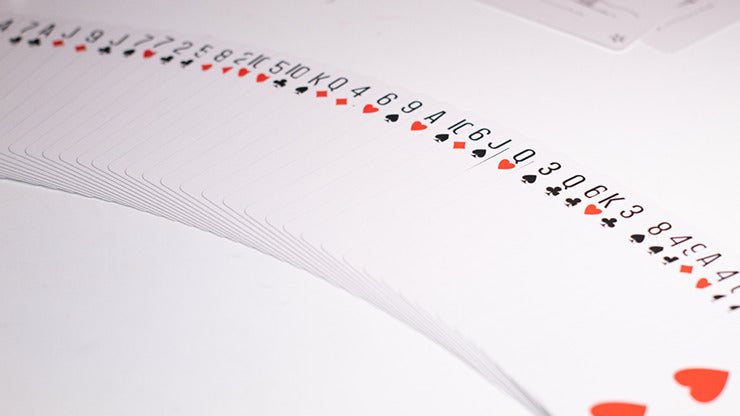 The tuck box displays the large spade pip on the front, and the back design on the back. All around the edge of the box you will find a pinstripe of blue and white. In between the lines is the rest of the info for the cards (along with a lovely spelling error in the word 'Playing'). When opening the tuck box you'll see a 'three of clubs' reveal. This deck holds a few more secrets, but only the curious will find them.