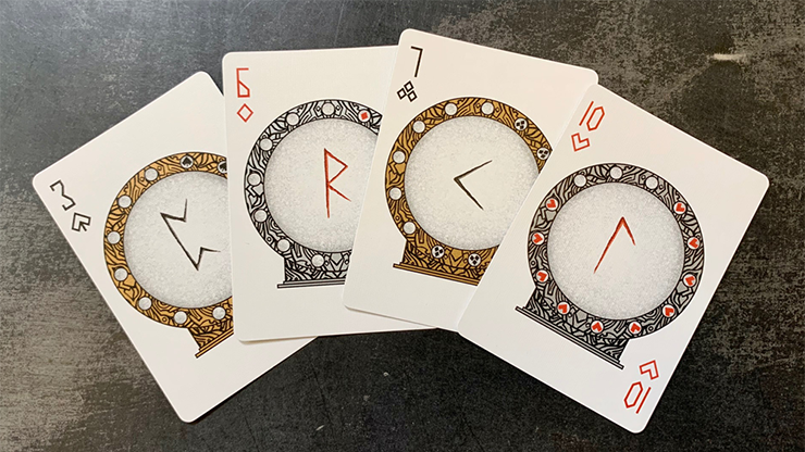 A completely custom deck of playing cards based on the Elder Futhark, the oldest runic alphabet from Germanic & Nordic tribes. You will find a total of 24 runic letters used on the number & court cards. The runes on the aces spell out the corresponding suit and the jokers feature a decorative octagram. The main feature of the back design is based on the famous rune circles. A double back & informational card are also included.