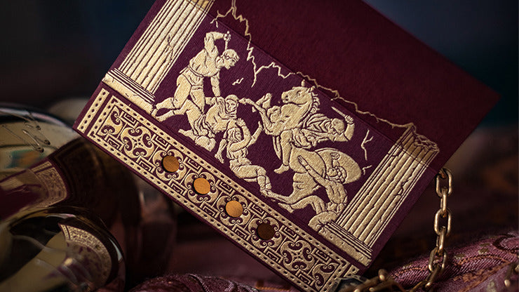 The cards feature fully custom fresco-style painted courts made to feel as if they were discovered from ancient ruins. The backs of each card features beautiful foil colored textiles (based on actual Roman patterns) that breed authenticity into the story.