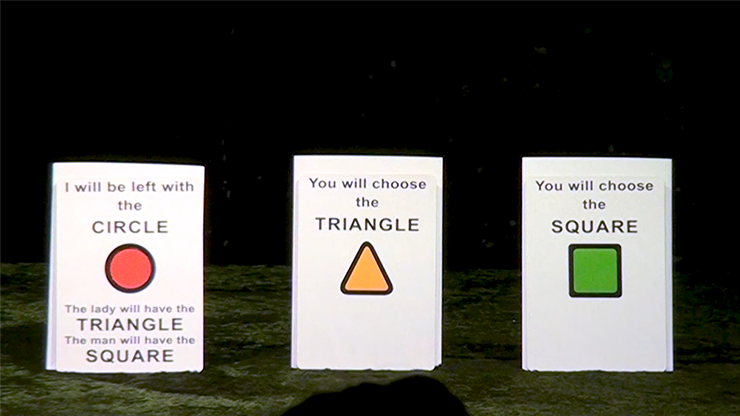 Using three envelopes with windows in form of geometrical figures and three prediction cards with colored back, you can perform an effect starting funny with a really powerful ending. The color of the geometrical figure determined by the backs of the prediction cards influences the spectators choices.