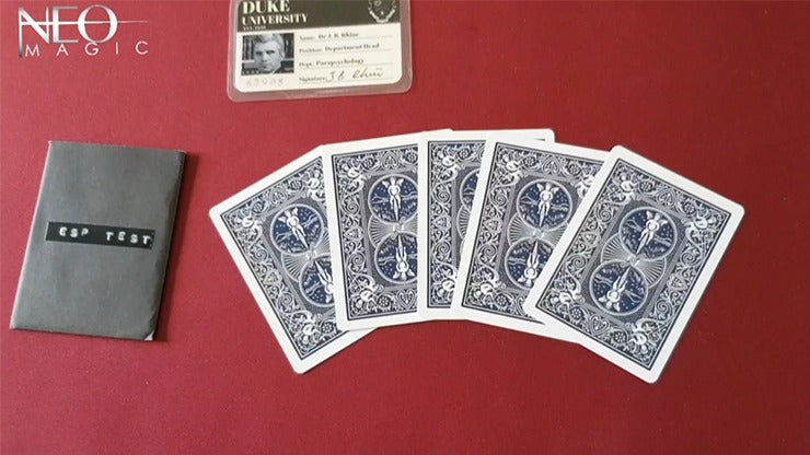 You withdraw five E.S.P. cards and Dr Rhine's I.D. card from an aged envelope. You lay the I.D. card down and ask the spectator to mix the five E.S.P. cards behind their back and then remove three cards face down.