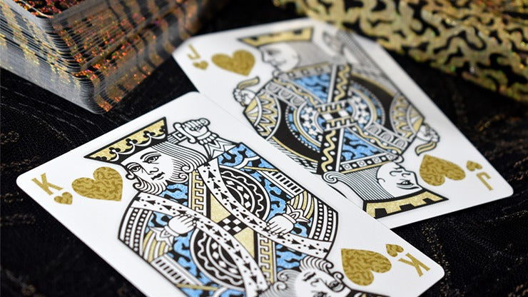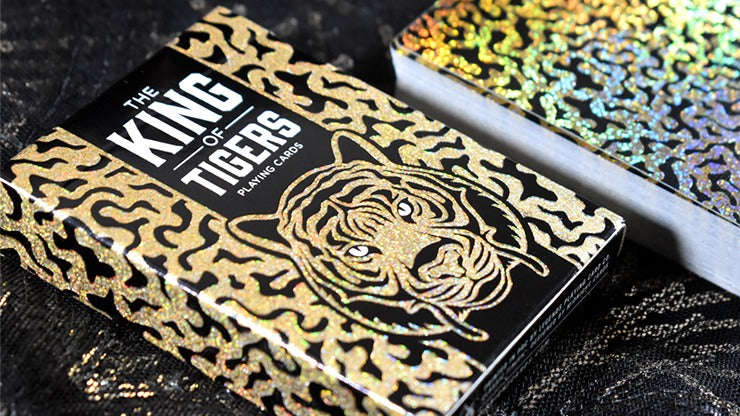 Printed by Legends Playing Card Co., with their China printer, the KING of TIGERS Gold deck utilizes their exceptional classic finish. The KING of TIGERS tuck box features black foil, gold holographic effects foil and a clear spot UV that's interspersed with silver glitter flakes. Besides a gorgeous look, the tuck box has a unique physical texture to it.
