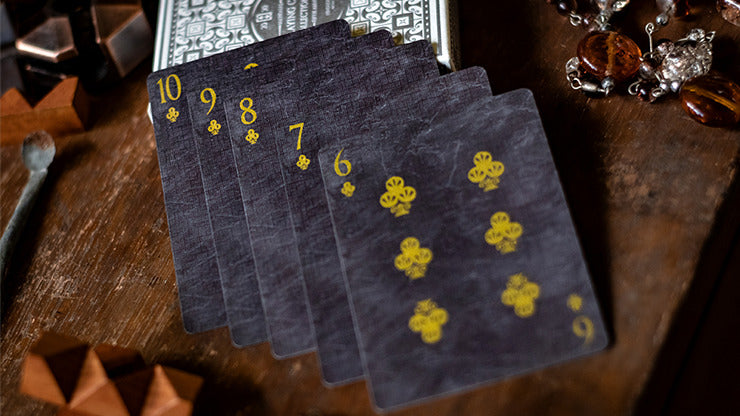 Each deck is a transforming enclosure that expands into a larger temple to reveal a classical golden frieze wrapping each side. Trapped within the box is the spirit of Death. Sealing each box is a large and purposeful warning, Intaglio engraved, telling you not to open the box. To open the box would mean to ignore and slice through the warning.