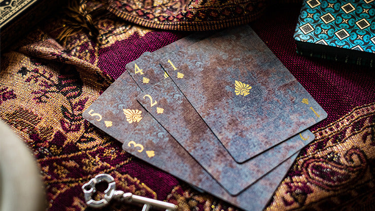 Each deck is a transforming enclosure that expands into a larger temple to reveal a classical golden frieze wrapping each side. Trapped within the box is the spirit of Disaster. Sealing each box is a large and purposeful warning, Intaglio engraved, telling you not to open the box. To open the box would mean to ignore and slice through the warning.