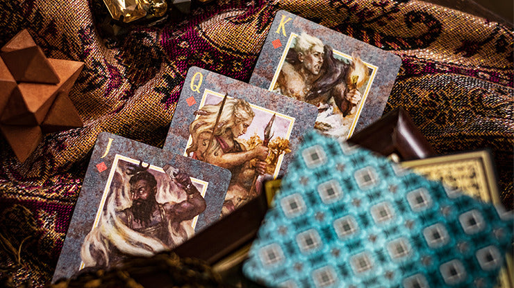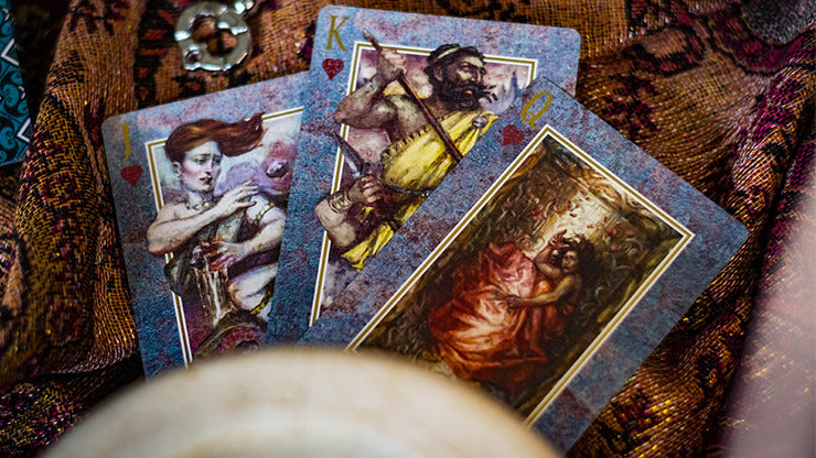 The cards feature fully custom fresco-style painted courts made to feel as if they were discovered from ancient ruins. The backs of each card features beautiful foil colored textiles (based on actual Roman patterns) that breed authenticity into the story.