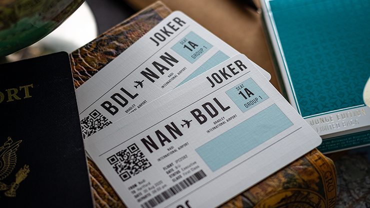 With the Limited Back version of the Lounge Edition in Terminal Teal, the deck provides an upgraded feel over the Standard Back version. The cards showcase re-colored standard faces and have an untraditional offset classic and casino inspired back design that pays homage to a vintage regional airline of years past with the teal colorway. On the Limited Back version, the back design is upgraded with both silver foil and clear UV spot varnish. The cards are traditionally cut to provide the ability to weave or faro shuffle facedown. The tuck box exhibits premium features with a durable synthetic stock material, clear UV spot varnish, and more silver foil than the Standard Back version.