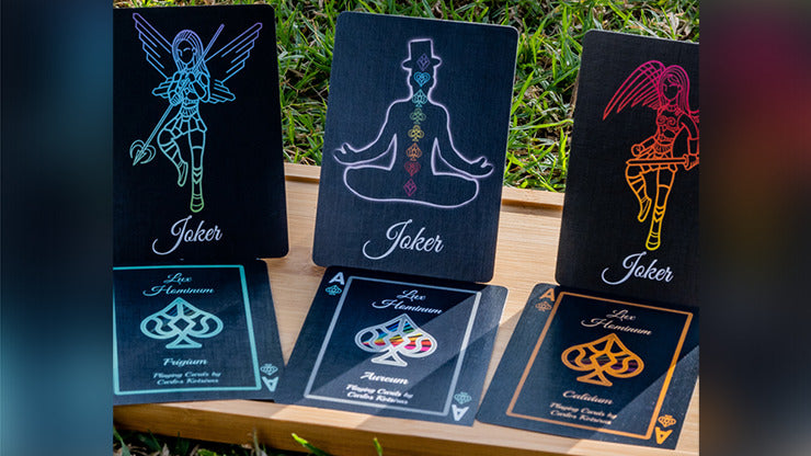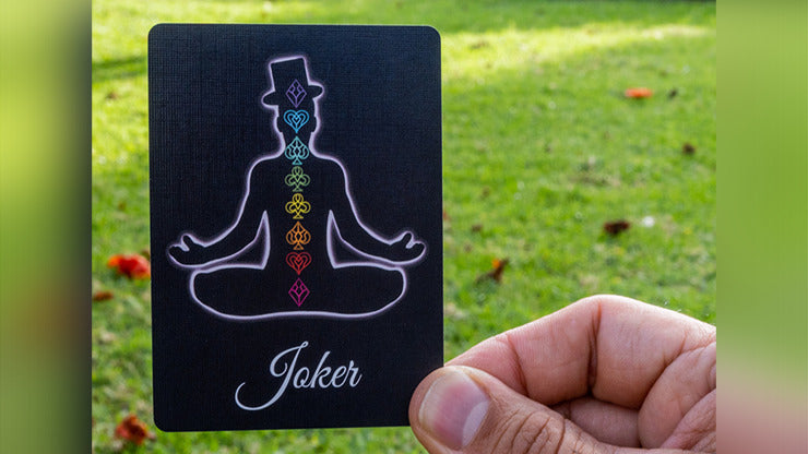 The Joker Aureum is a magician who is meditating reaching enlightenment through the alignment of the chakras. Represented by the suits of the deck.