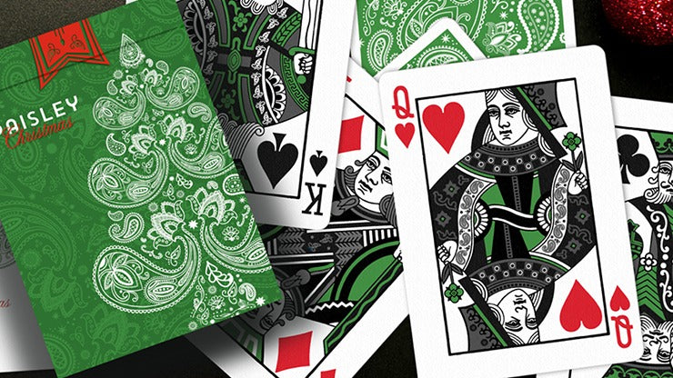 Paisley Playing Cards were developed for the magician, and cardists in mind. Therefore, the Paisley Green Metallic Edition has a classy traditional look to maintain familiarity. However, the design team gave the Jokers and tuck a special Paisley Christmas design update, which makes this deck the ultimate performance deck during the Christmas season. But what is a Holiday Season without gifts? The design team created a special Paisley Christmas pillow gift box for this deck and it will be included with every deck!