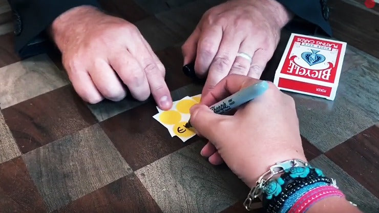Take out of your jacket pocket a deck of cards, a marker and some stickers.