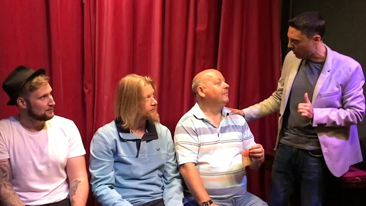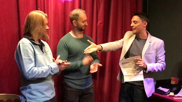 He now flips over the chairs, showing the bottom of them, and only underneath the lucky spectator's chair is an envelope, that once opened reveals a piece of paper with the writing: "The person who sits on this chair will be the lucky one. P.S. I am sorry that the other two spectators didn't win the diamond ring or the 100 Euros!"