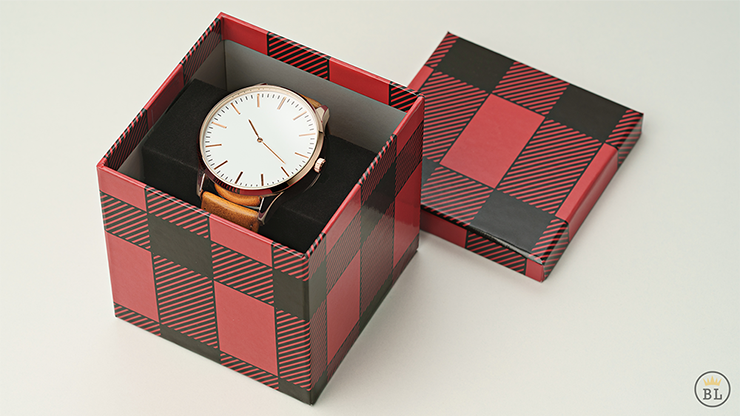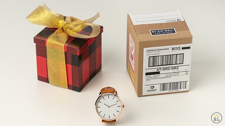 The magician then walks over to the table and picks up the mysterious package.The package is opened, and from it the spectator removes a red gift box tied with a golden bow. The spectator then unties the bow, removes the lid and finds inside a beautiful wrist watch. The watch is cleanly placed on the spectators palm.