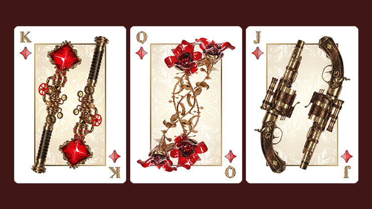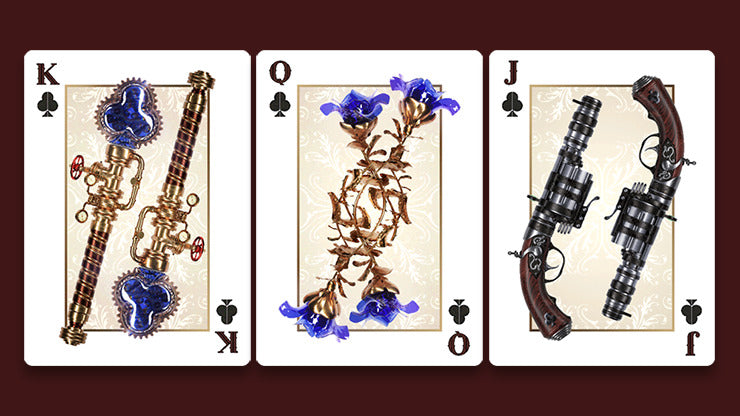 The Victorian Playing Cards Steampunk Edition deck is a new design based on the previous successful Victorian campaign. It is composed of fifty two cards and two jokers. The project main idea is to replace the traditional court cards by symbols: scepter for the king, rose for the queen and pistol for the jack. Other cards stays as usual. The main colors of the indexes are gold for the red and dark brown for the blacks. The cards are mirrored so they look the same upside down with subtitle differences.